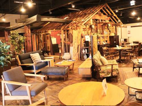 1Fフロア左側には、古民家を丁寧に解体して梁と柱を移築・再構築した展示空間が広がります。古い時代のタンスやどこか懐かしさを感じる古民具も人気商品。座卓やローソファをはじめ、ギャッベやトライバルラグ、ペルシャじゅうたんなど素材や織りにこだわったラグ類もご覧いただけます。