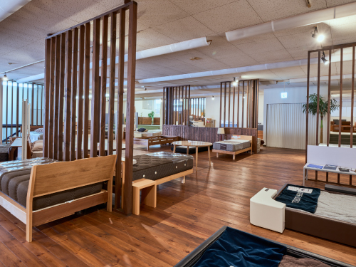 2Fフロアには、木のベッド・ウォーターベッド・畳ベッド、タンス・デスク・大型会議テーブル・下駄箱などを幅広く展示しています。天然木の表情や重厚感、丁寧なつくりは長く使う家具だからこそ大切なポイント。アウトレット品も含め、実物を見ながらご検討いただけます。