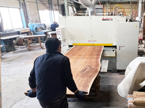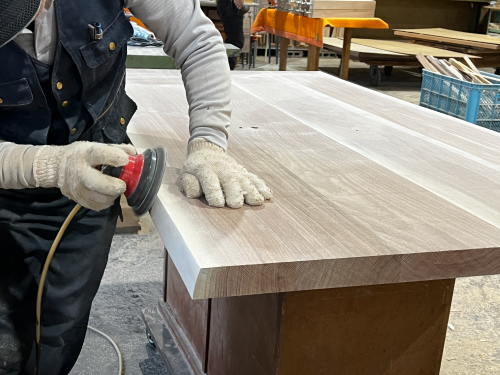 1Fショールームの奥では、常に工場が稼働しています。長年家具づくりに携わってきた熟練の職人が木材の状態や木目の流れを見極めながらひとつひとつの工程を丁寧に重ね、家具を製作しています。設計から加工、仕上げにいたるまで、大量生産では行き届かない細部にまで気を配り、素材本来の魅力を引き出すことを大切にしています。