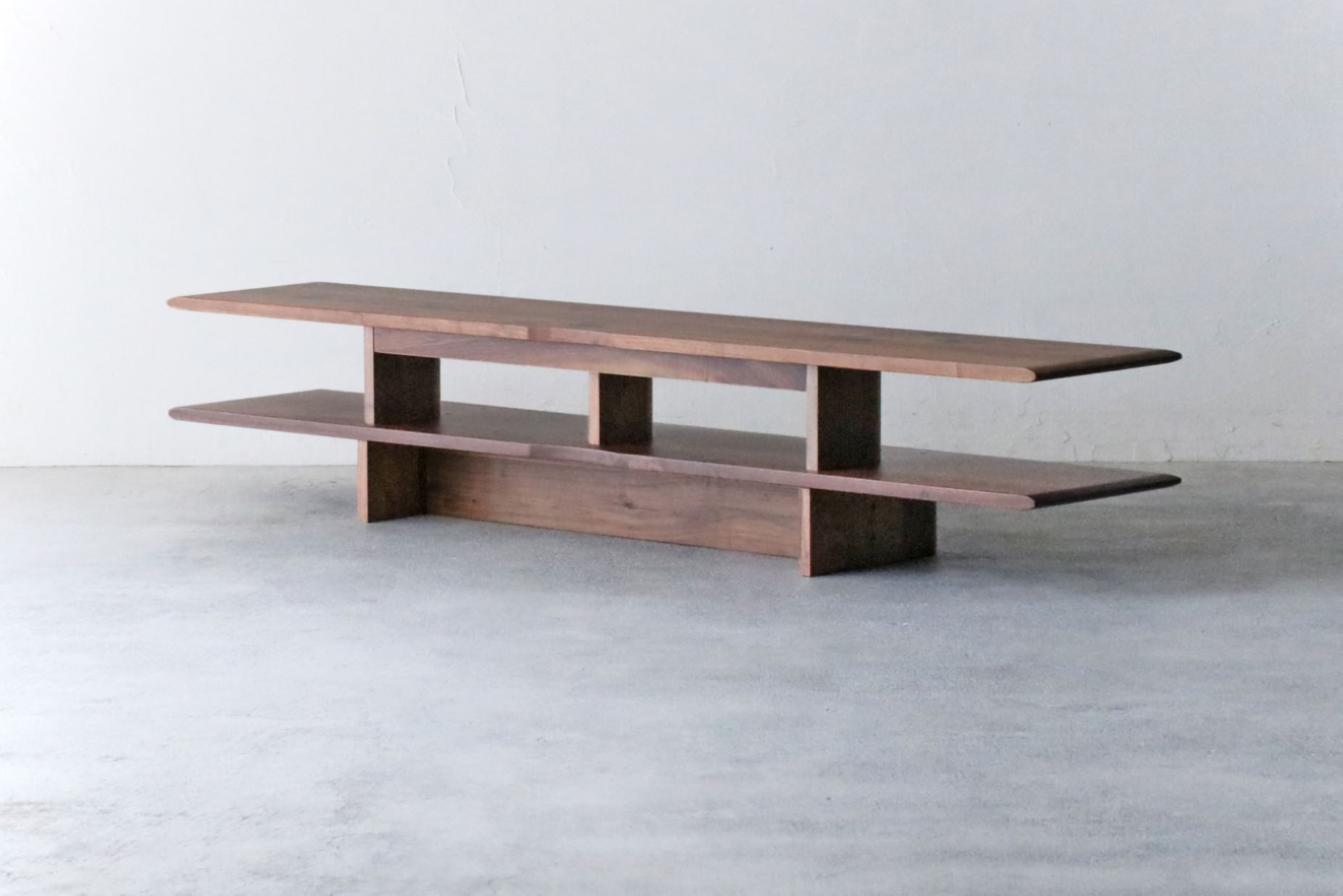 25mmの無垢材の板にシャープな面加工を施したシンプルなテレビボード。