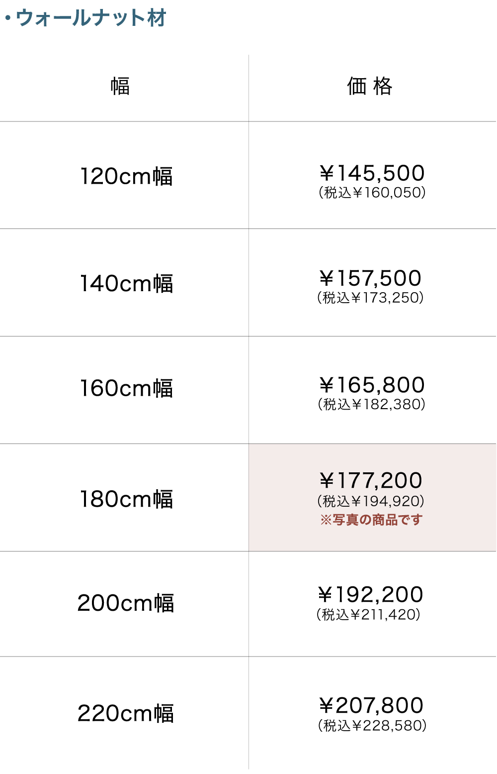 樹種はウォールナット材・ブラックチェリー材・オーク材の3種類から、幅は120cm〜220cmまでの6サイズからお好みに合わせてお選びいただけます。