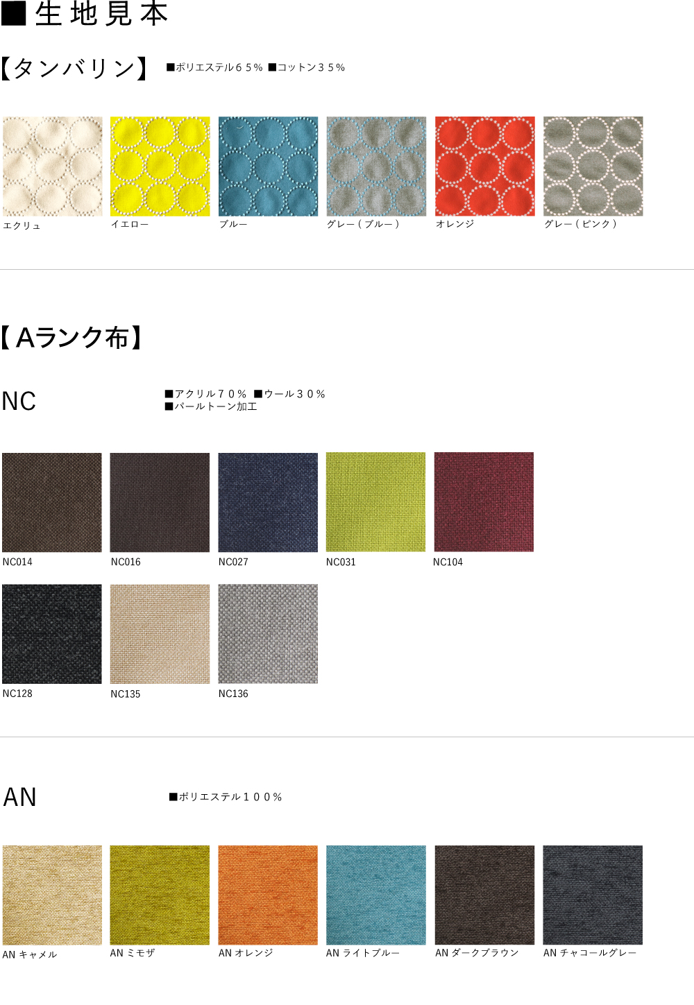 | 張り地 | 下記の表よりお選びいただけます。 ※写真の商品の張り地は「メイン(背もたれ前面部・座面上部)【タンバリン布】ブルー 」、「その他(背もたれ背面部・座面下部・サイド)【Aランク布】NC136 」です。 ※写真のタンバリン生地はリニューアル前の生地です。お選びいただきます「ブルー」と若干色味が異なります。 |