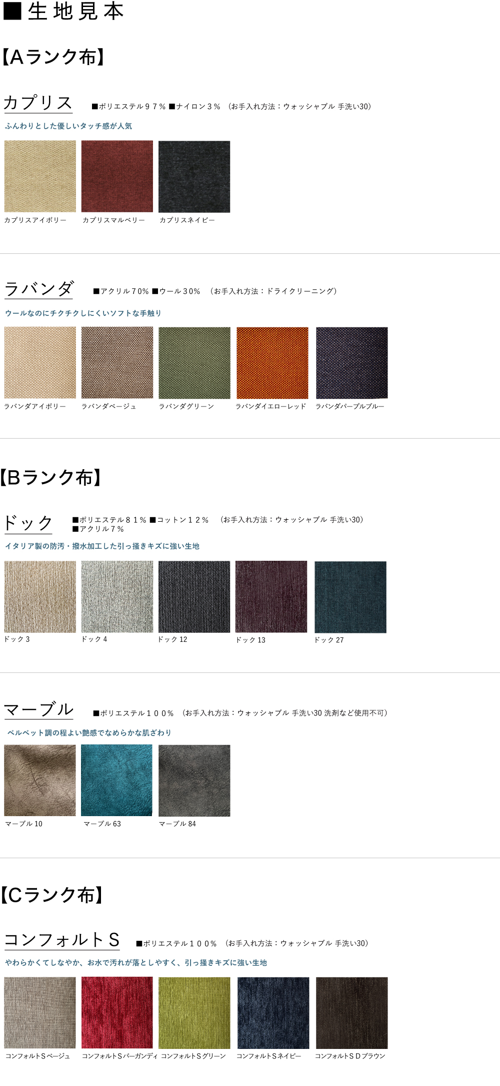 | 張り地 | 下記の表よりお選びいただけます。 ※写真の商品の張り地は「 【Aランク布】 カプリスDグレー」です。 |