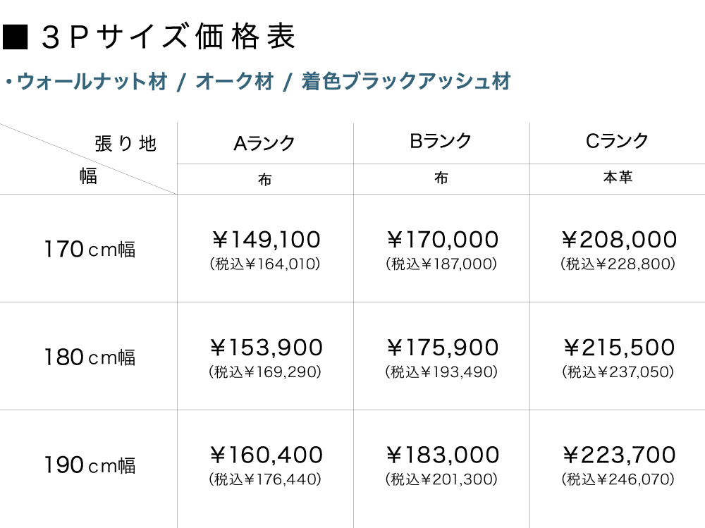 ※3Pサイズ(170cm・180cm・190cm)はプルダウンでお選びいただけないため、お問い合わせ欄にてご連絡ください。(希望サイズ・張り地・材質をお知らせください)改めましてお見積りをお送りいたします。