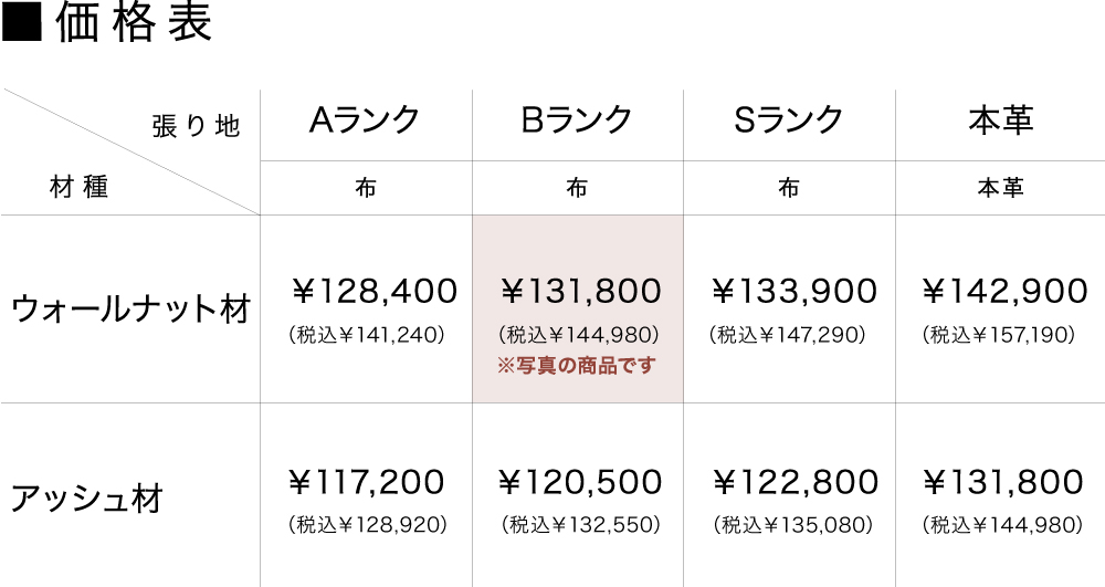 樹種はウォールナット材・ホワイトアッシュ材の2種類から、張り地は35種類からお好みに合わせてお選びいただけます。