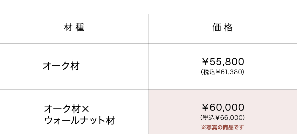 | 素 材 | オーク材xウォールナット材 ※2種からお選びいただけます。 オーク材・オーク材xウォールナット材 |