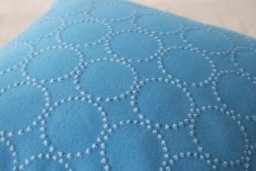 ふっくらと盛り上がった小さなドットが連なって輪になった刺繍を施しています。一見シンプルに見える柄ですが、1つ1つの糸の膨らみや形、間隔に違いがあります。正円では無くフリーハンドで書かれたものをテキスタイルにしており、不揃いがまとまって揃っているように感じる魅力的な柄です。
