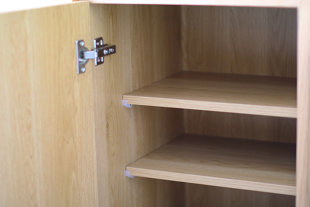 棚板は4枚ついており、高さは収納物に合わせて、3cmピッチで12段階の調整ができます。2杯の引き出しはスライドレール付きなので出し入れがスムーズに出来ます。