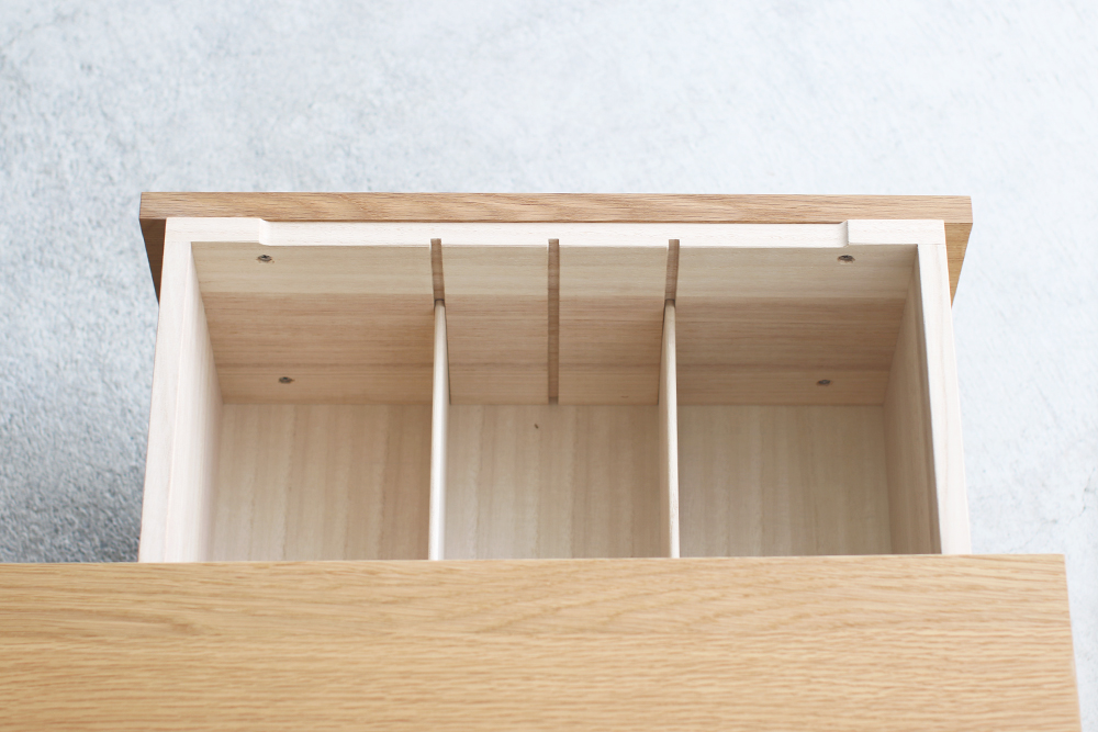 それぞれの引き出しには移動可能な仕切り板がついているので、引き出しの中もきれいに保つことができます。