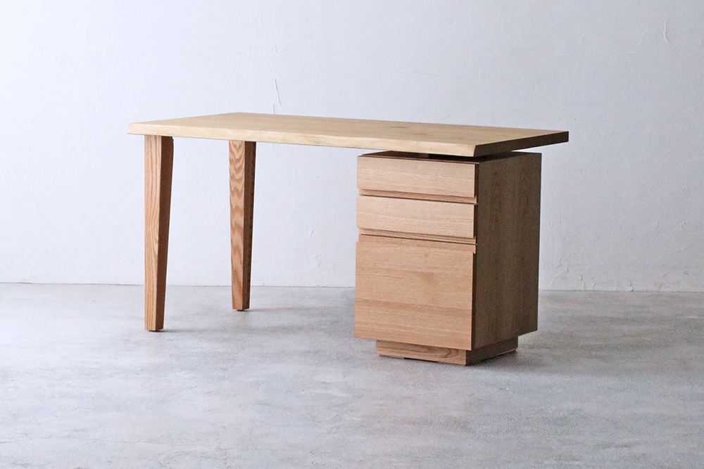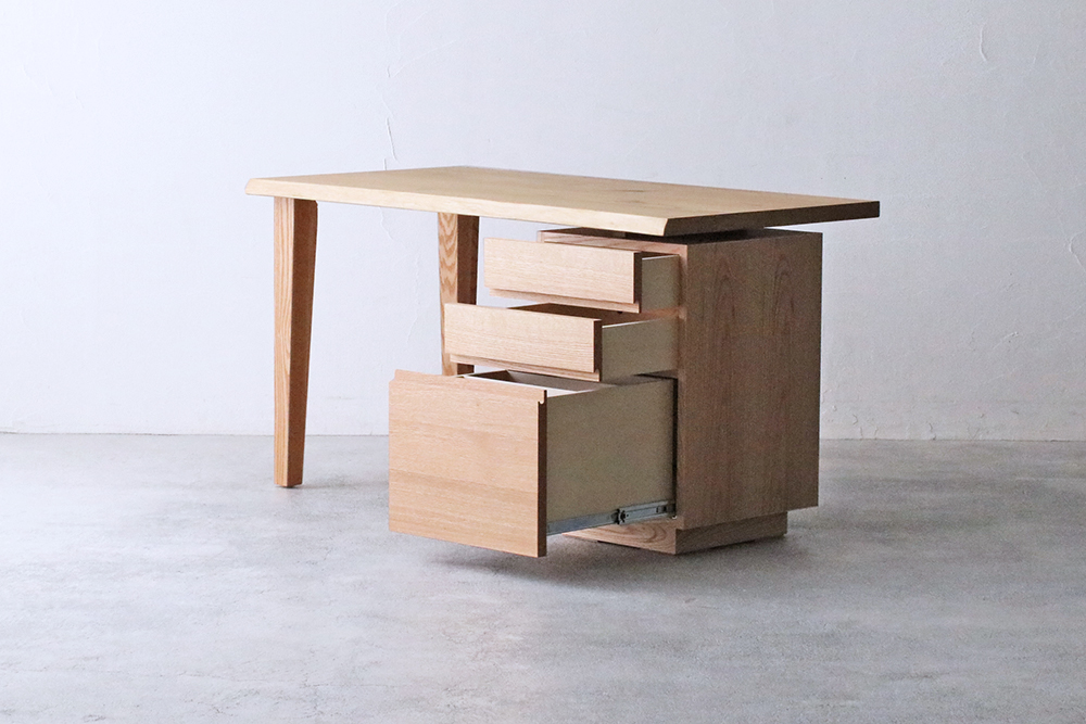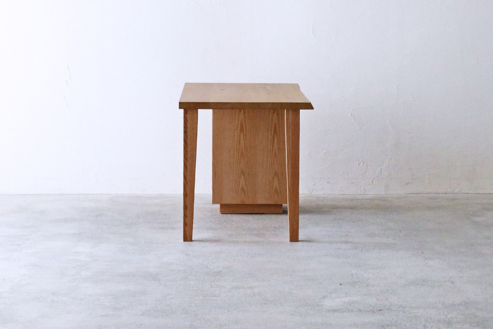 材種はウォールナット材・クリ材×オーク材の2種類から、幅は130cm〜180cmまで、奥行は65cm・80cmから、塗装はオイル仕上げとウレタン仕上げの2種類からお好みに合わせてお選びいただけます。また、引き出しの位置は天板の右側か左側どちらにでもおつけできます。(ウォールナット材はこちらをご覧ください。)