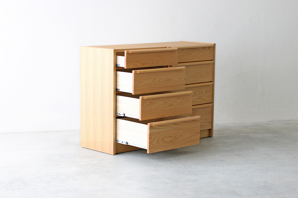 8つの引き出しは、深さが3種類あり、衣類を分別して収納する時に便利です。引き出しには全てスライドレールがついており、フルオープンになるので開け閉めがしやすく、衣類の出し入れも簡単です。