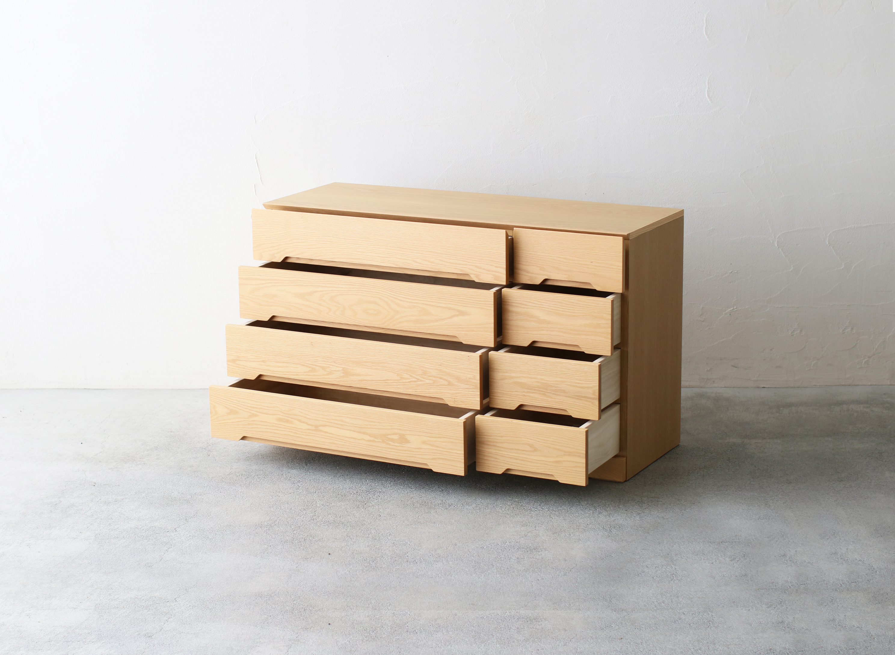 引き出しの前板は全て無垢材の通し杢で加工しており、2列に分かれる引き出しも木目が揃うようにこだわり仕上げています。