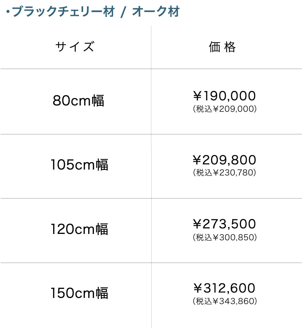 樹種はウォールナット材・ブラックチェリー材・オーク材の3種類から、幅は80cmから150cmまでの4種類からお好みに合わせてお選びいただけます。