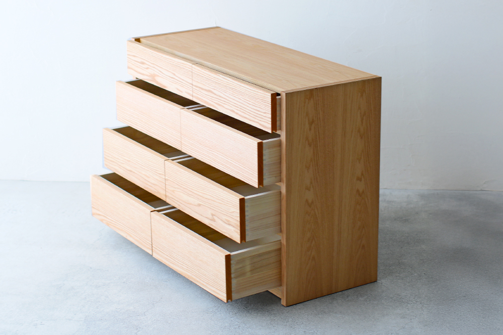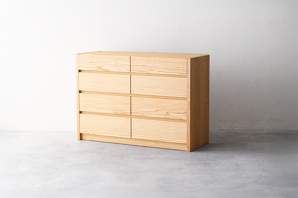 | 仕 様 | 前板:オーク無垢材 天板・側板・背板:オーク突き板材 引き出し内部:桐材 |