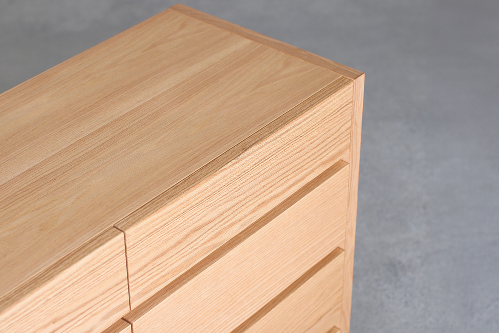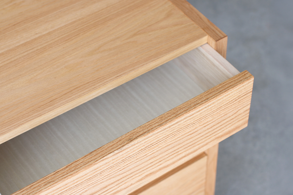 日常使いに合うように、ナチュラル色の明るい印象のオーク材を本体に採用。引き出しは前板と内部に無垢材を使用しているため、木目に重厚感と美しさがあります。