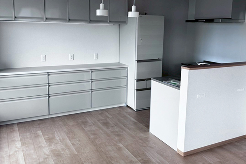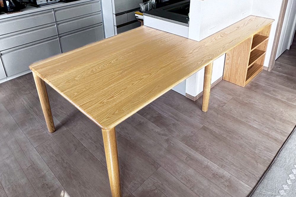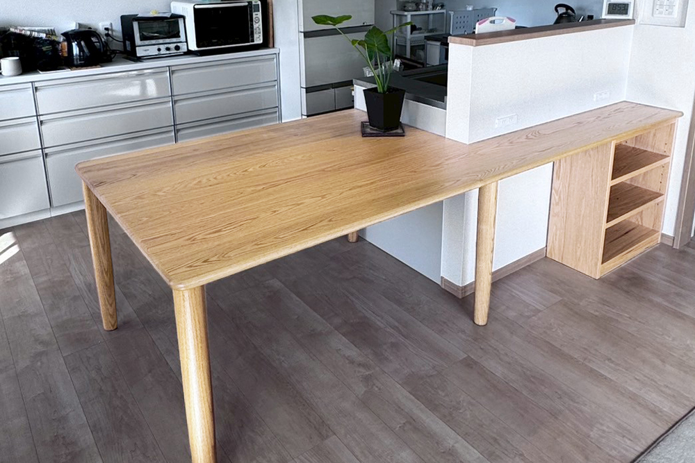 広々とした素敵なキッチンに、カウンター付の変形ダイニングテーブルを造らせていただきました。
