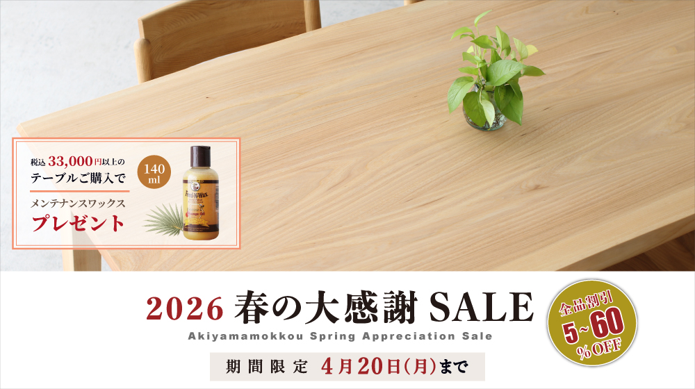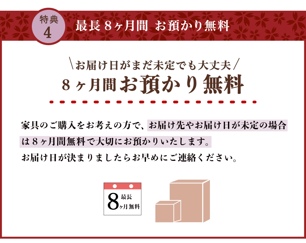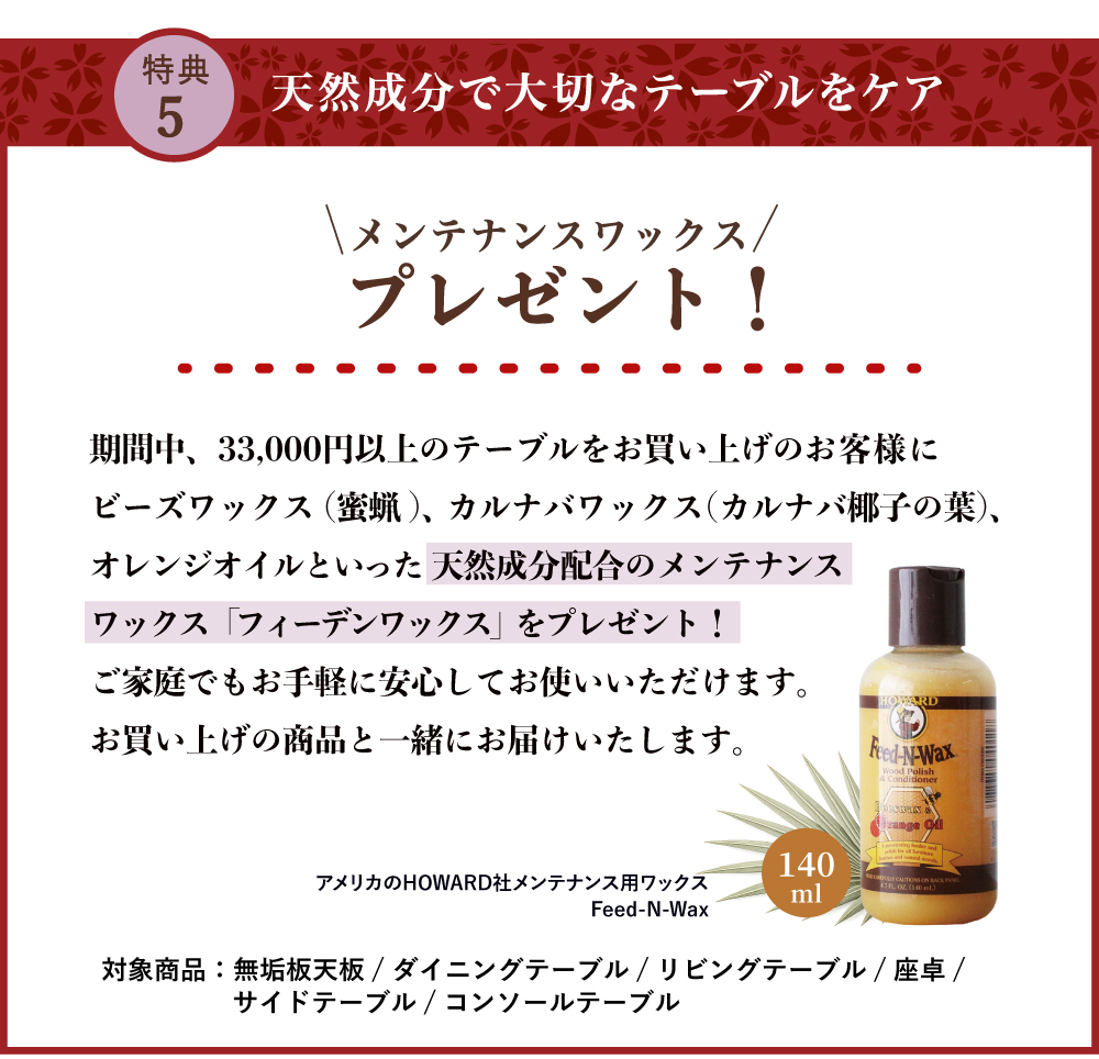 また、新築やリフォーム工事中の方、お届け先住所がまだ確定していないお客様にもご安心していただけるよう8ヶ月間無料でお預かりいたします。さらに税込33,000円以上のテーブルをご購入でメンテナンスワックスをプレゼント。
