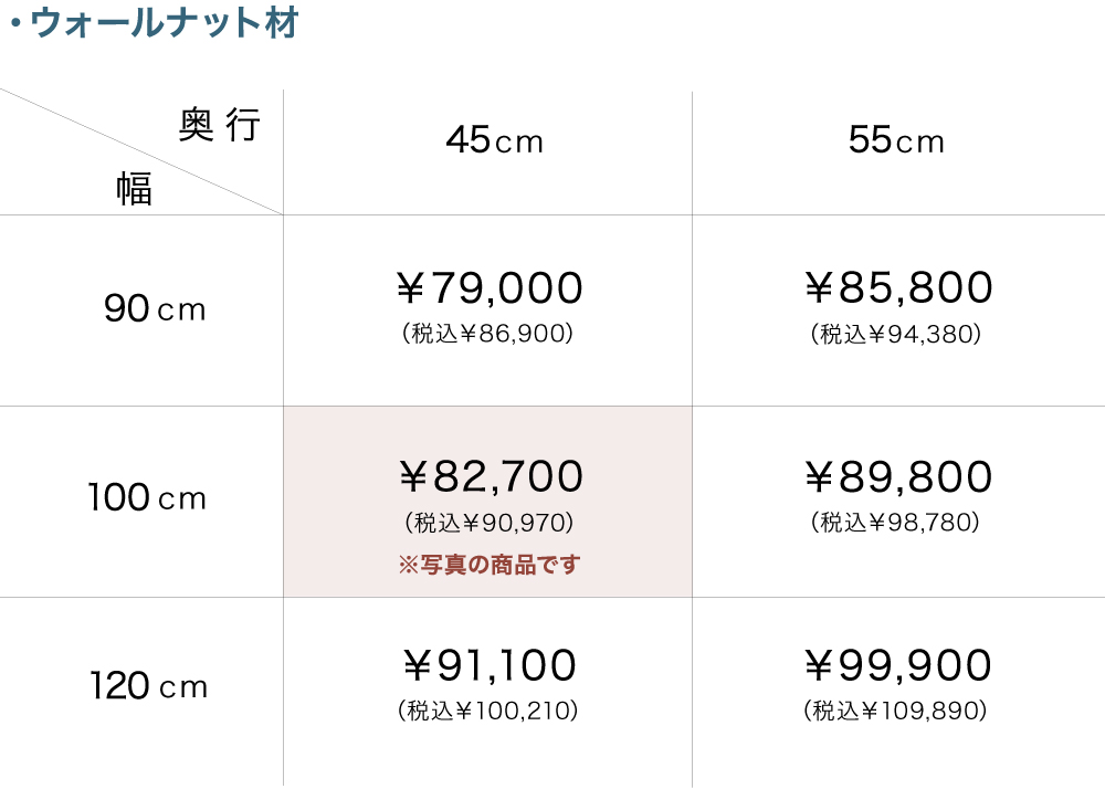 | サイズ | W100xD45xH40(cm) ※幅は90cm・100cm・120cmから、奥行は45㎝・55cmまでお選びいただけます。 |