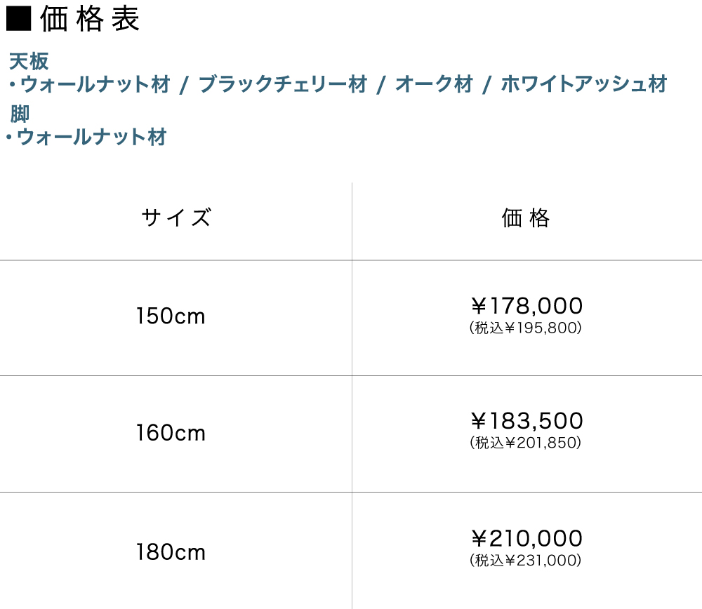 天板の樹種はウォールナット材・ブラックチェリー材・オーク材・ホワイトアッシュ材の4種類から、幅は150cmから180cmからお好みに合わせてお選びいただけます。