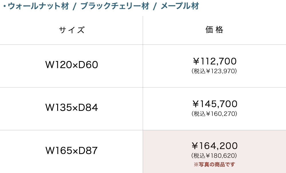 樹種はウォールナット材・ブラックチェリー材・オーク材・メープル材の4種類から、サイズは幅120cm、幅135cm、幅165cmの3サイズから、お好みに合わせてお選びいただけます。