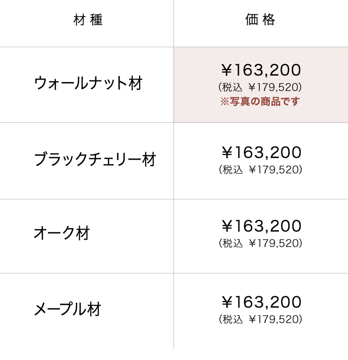 樹種はウォールナット材・ブラックチェリー材・オーク材・メープル材の4 種類からお好みに合わせてお選びいただけます。