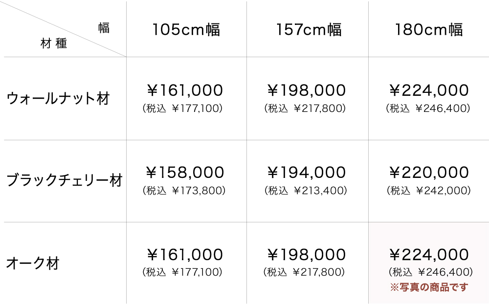 樹種はウォールナット材・ブラックチェリー材・オーク材の3種類から、幅は105cmから180cmまでの3サイズからお好みに合わせてお選びいただけます。