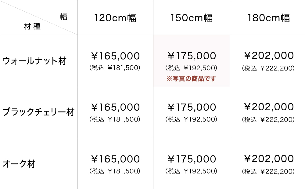 樹種はウォールナット材・ブラックチェリー材・オーク材の3種類から、幅は120cmから180cmまでの3サイズからお好みに合わせてお選びいただけます。