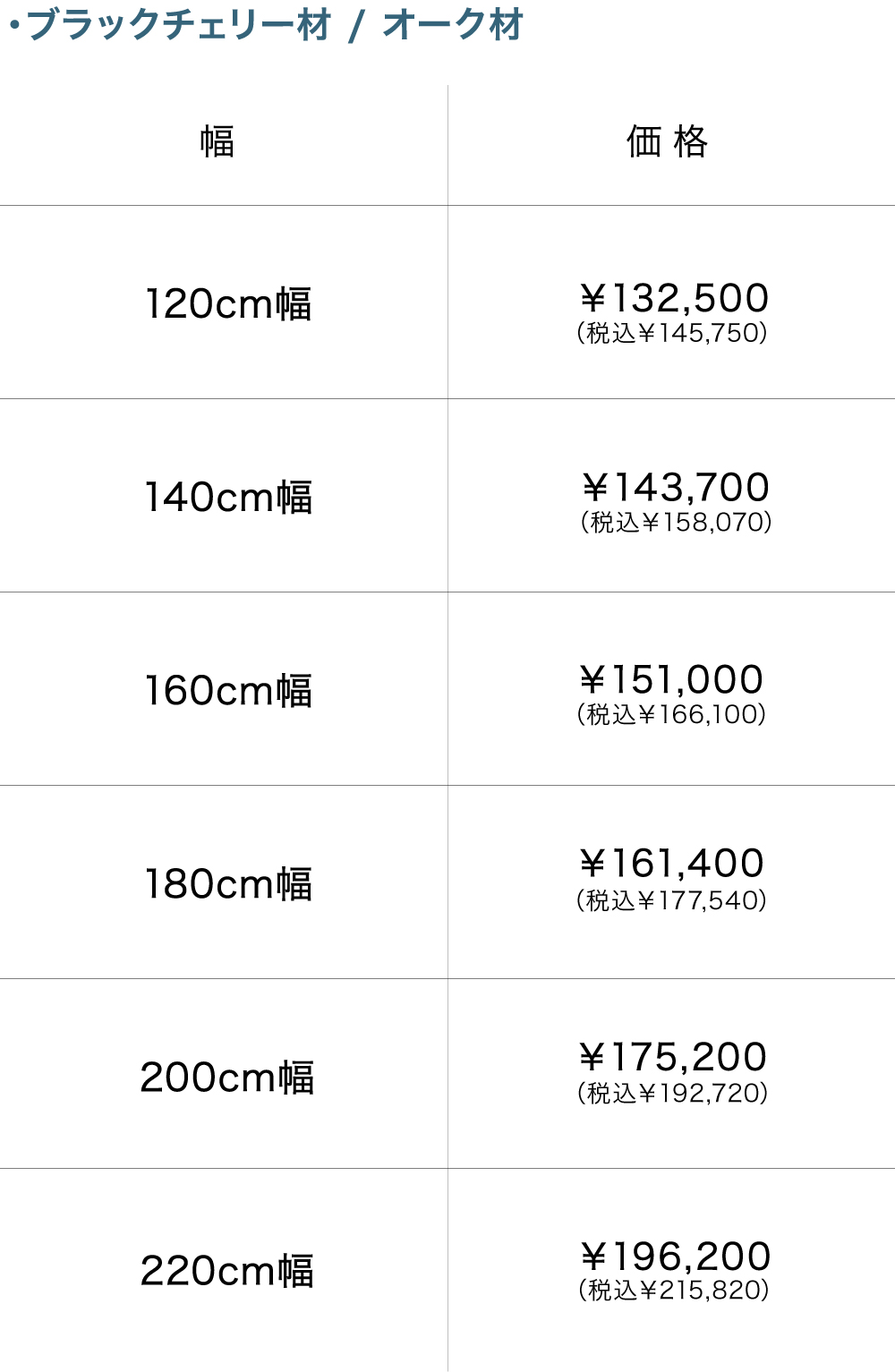 樹種はウォールナット材・ブラックチェリー材・オーク材の3種類から、幅は120cm〜220cmまでの6サイズからお好みに合わせてお選びいただけます。