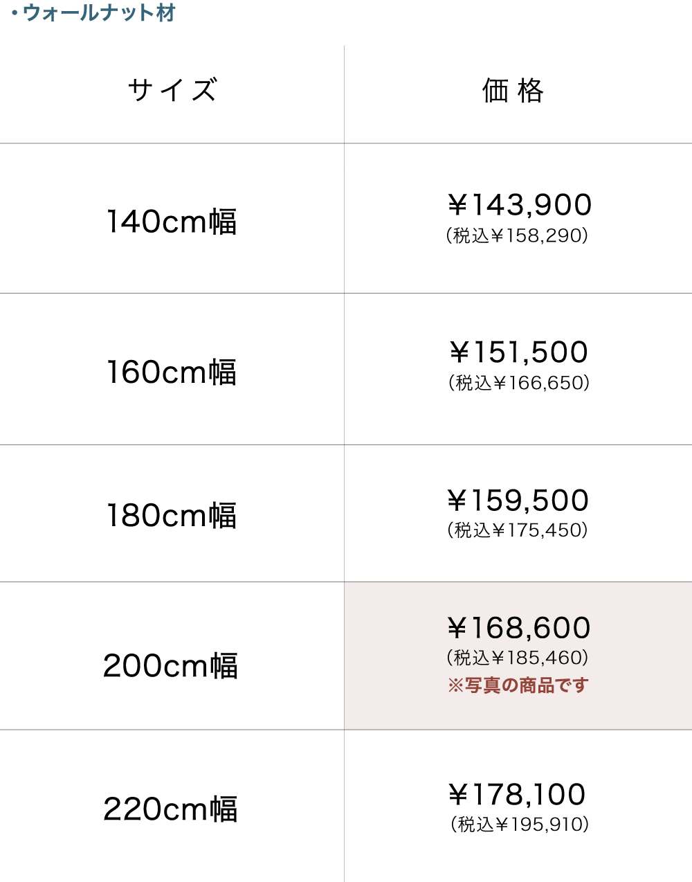 樹種はウォールナット材・ブラックチェリー材・オーク材の3種類から、幅は140cm〜220cmまでの5サイズからお好みに合わせてお選びいただけます。どのサイズでも、中央デッキスペースのサイズ50cmは共通です。左右の引き出しの大きさが10cmずつ変わります。