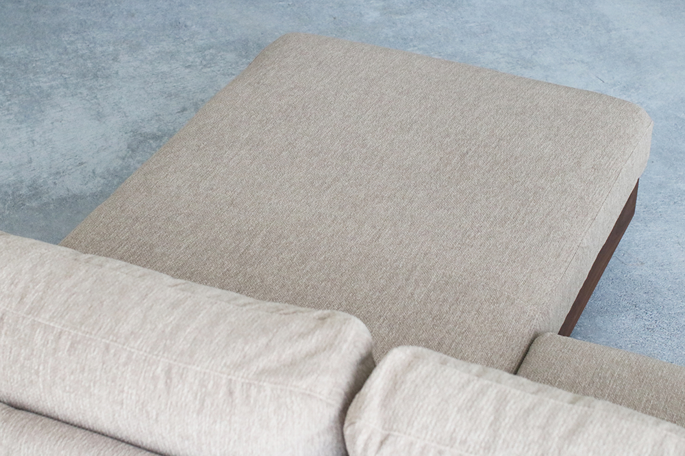 背もたれ部分のクッションは、ウレタンフォーム50%・フェザー50%(フェザーMIX)のボリューム感ある仕様ですのでちょうど良い沈み心地です。座面はウレタンフォームですので身体をしっかり支えてくれます。座面・背面共にカバーリング仕様で、取り外しができお洗濯もできます。クッションにはダブルステッチが入ります。