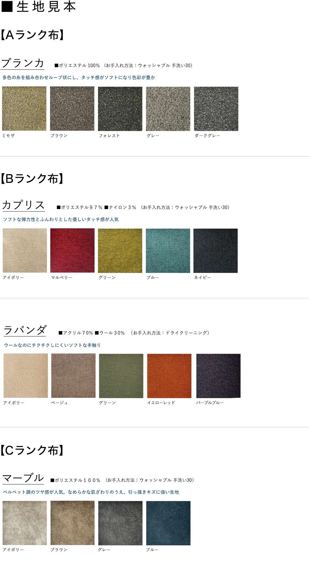 | 張り地 | 下記の表よりお選びいただけます。 ※写真の商品の張り地は「 アモンドチャコールグレー(生産終了生地)」です。 |