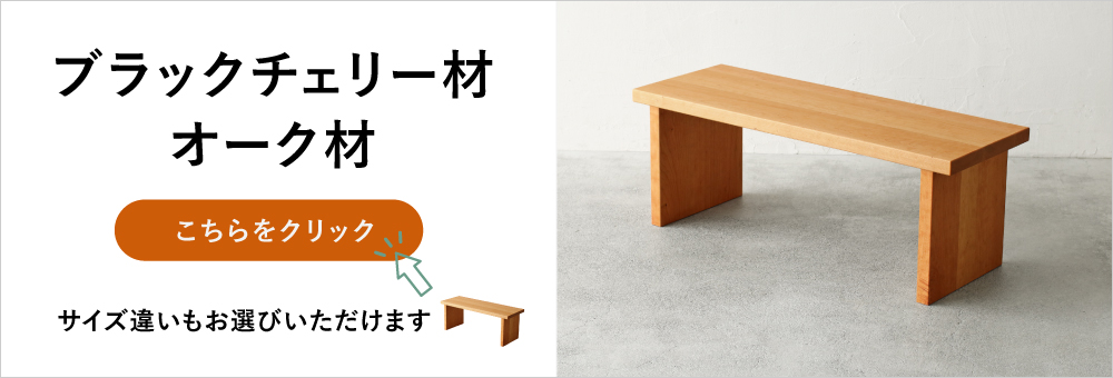 材種はウォールナット材・ブラックチェリー材・オーク材の3種類から、幅は42cmから180cmまで、奥行きは30cmから42cmまで、塗装はオイル仕上げとウレタン仕上げの2種類からお好みに合わせてお選びいただけます。
