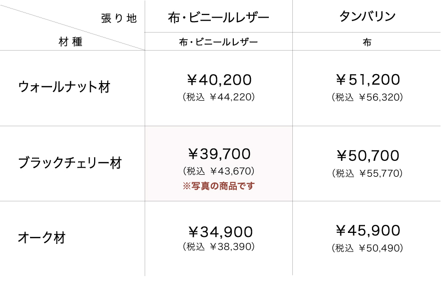 樹種はウォールナット材・ブラックチェリー材・オーク材の3種類から、張り地は30種類からお好みに合わせてお選びいただけます。