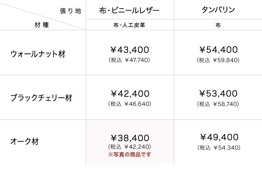 樹種はウォールナット材・ブラックチェリー材・オーク材の3種類から、張り地は30種類からお好みに合わせてお選びいただけます。