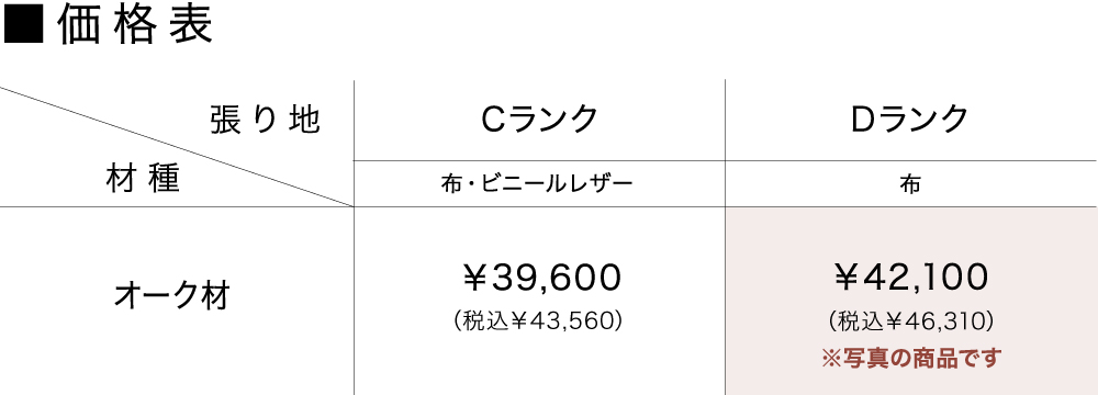 | 張り地 | 下記の表よりお選びいただけます。 ※写真の商品の張り地は「【Dランク布】 UP641」です。 |