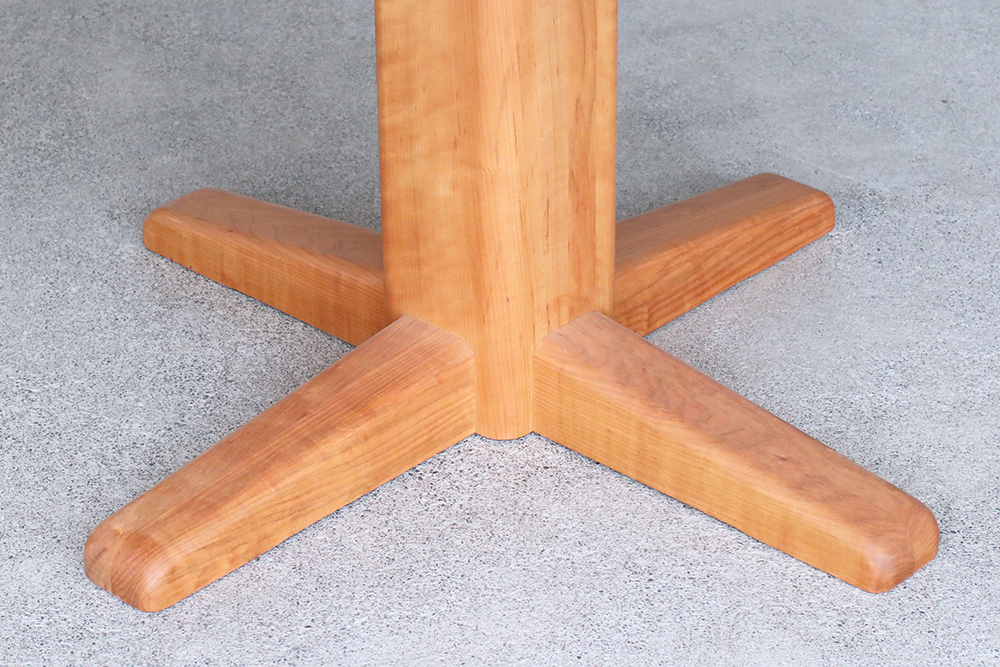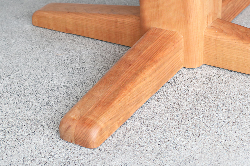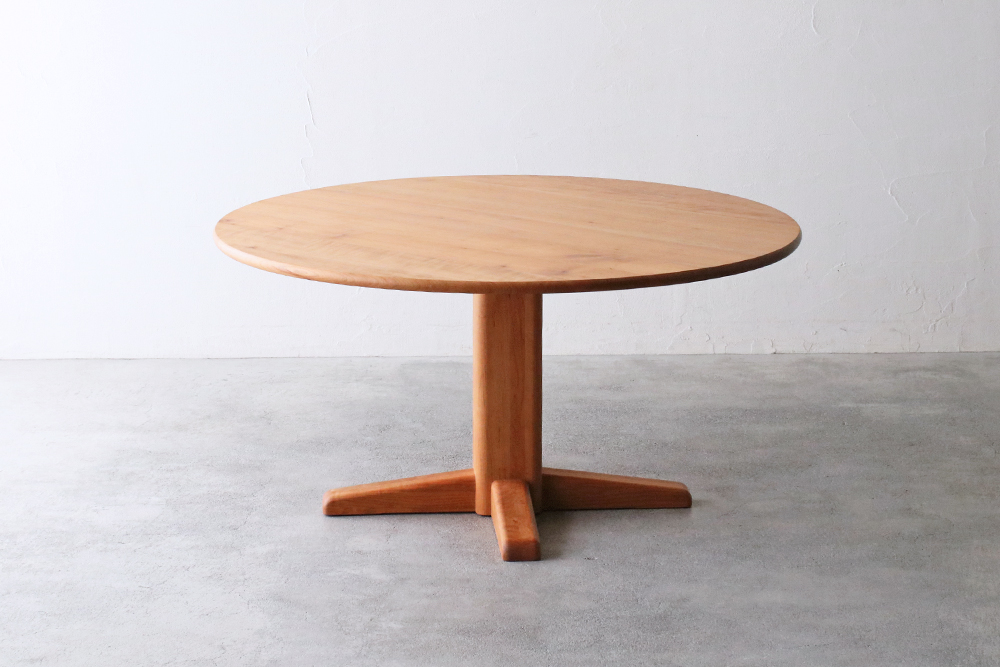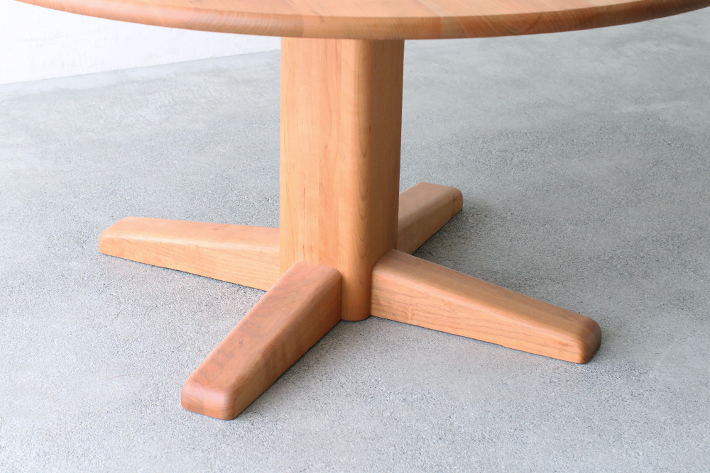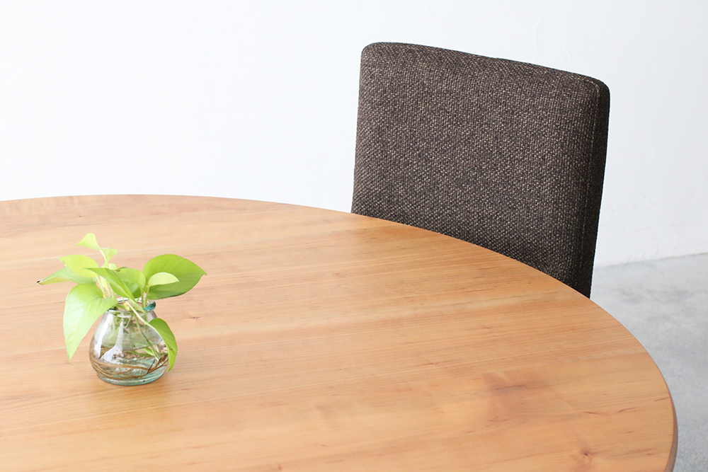 厚さ3cmの天板を支えている一本脚は、太さはあるものの天板の中央に配されているため、チェアや足下の邪魔をせず、広々とした空間を保ってくれ、大振りのチェアをセレクトすることが出来ます。人数が増えた時も、脚が邪魔にならず無理なく座っていただけます。