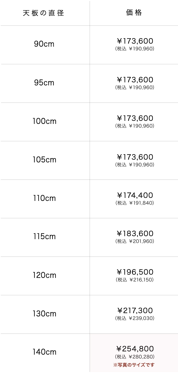 | サイズ | φ140xH70.5(cm) 天板厚:3(cm) ※天板直径は90cmから140cmまでお選びいただけます。 |