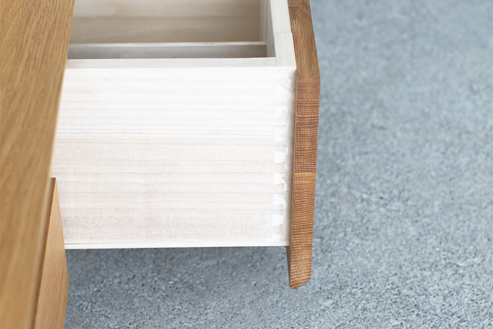 小口がテーパー加工された天板、側板を留め加工でつないだ門型のフォルムから「MON」と名付けられました。引出しは、釘などの金物は一切使わず、伝統の匠の技「蟻組工法」で作られています。