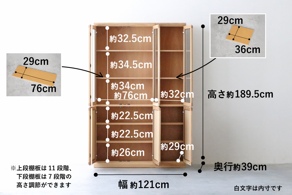 開き戸内部にはそれぞれ棚板2枚づつついており、位置は上は11段階、下は7段階からお選びいただけます。