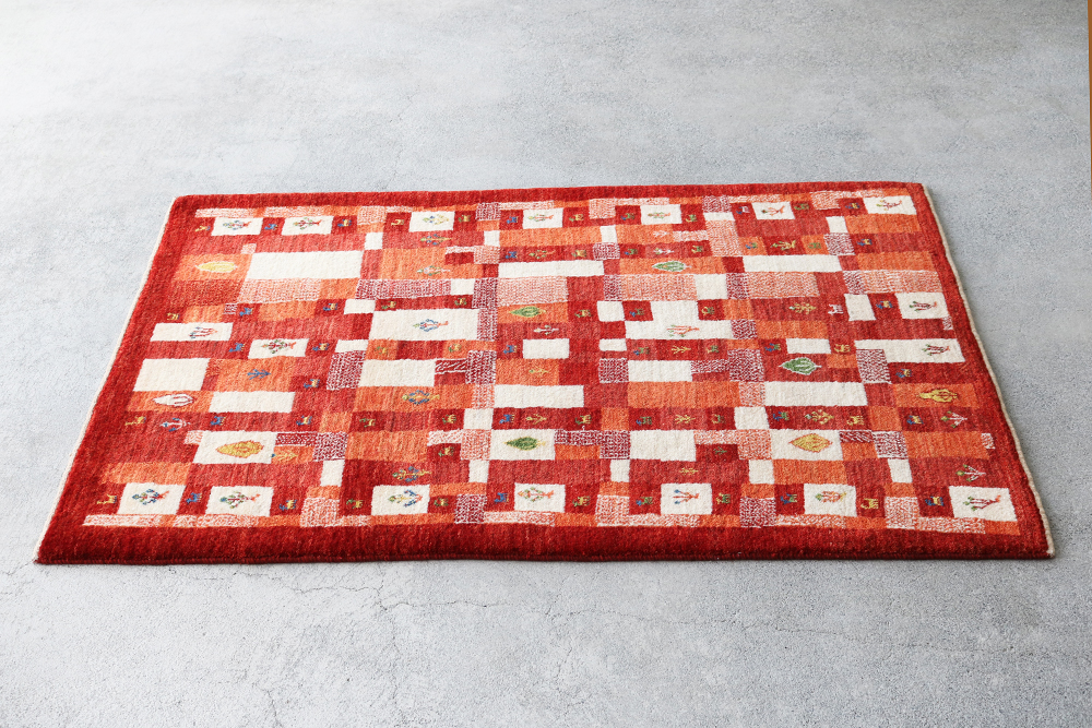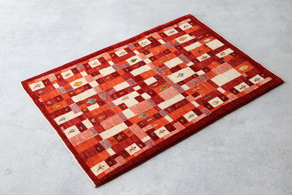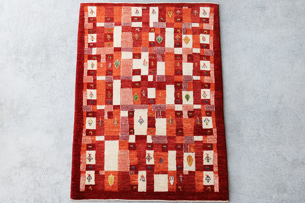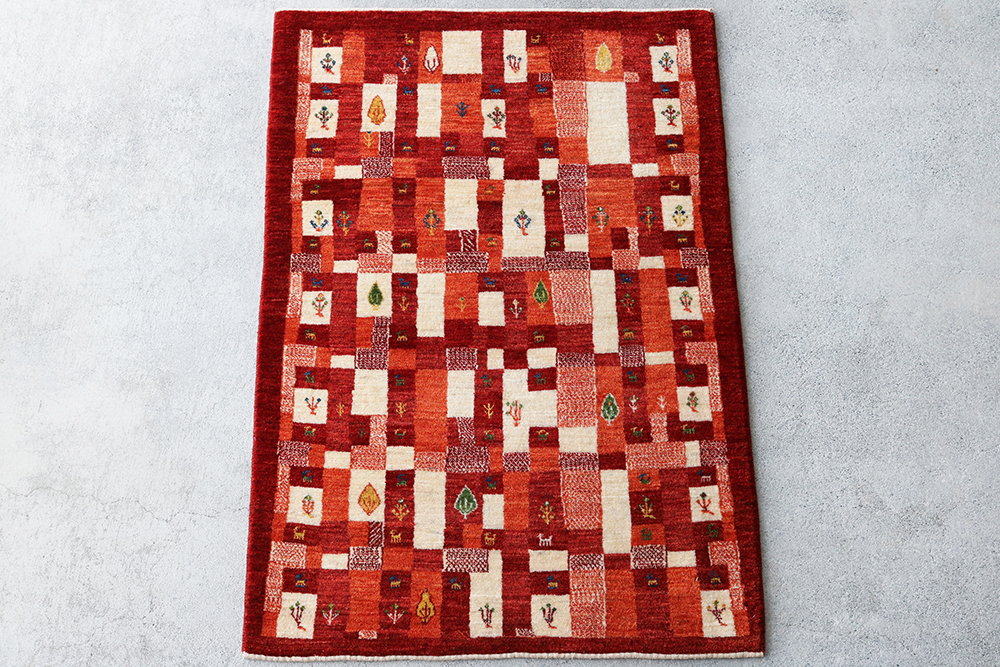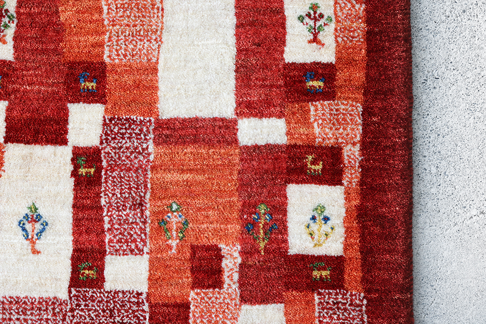 明るい赤色にパッチワーク柄が映えた一枚。アイボリーの原毛や、グラデーションになった赤が可愛いですね。四角の中には植物や動物の文様が織り込まれています。カシュクリランクなので、織り目は非常に細かく、文様が美しく映えたギャッベです。縁は、色の濃さが違う赤の2色で編み込まれています。ギャッベは、イランの遊牧民が一枚一枚手織りした絨毯なので一点物となります。