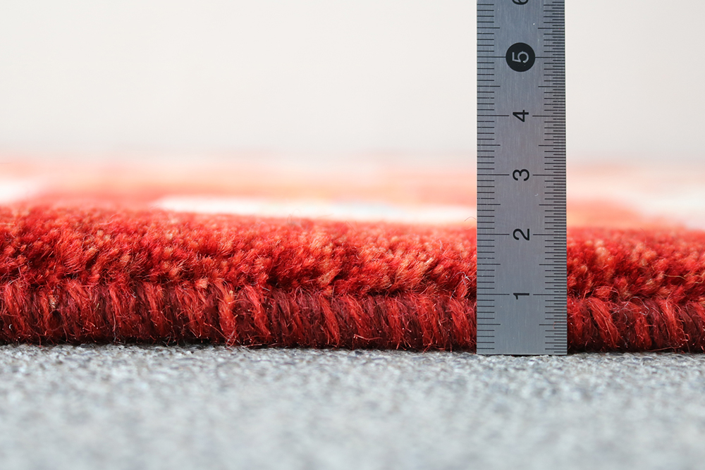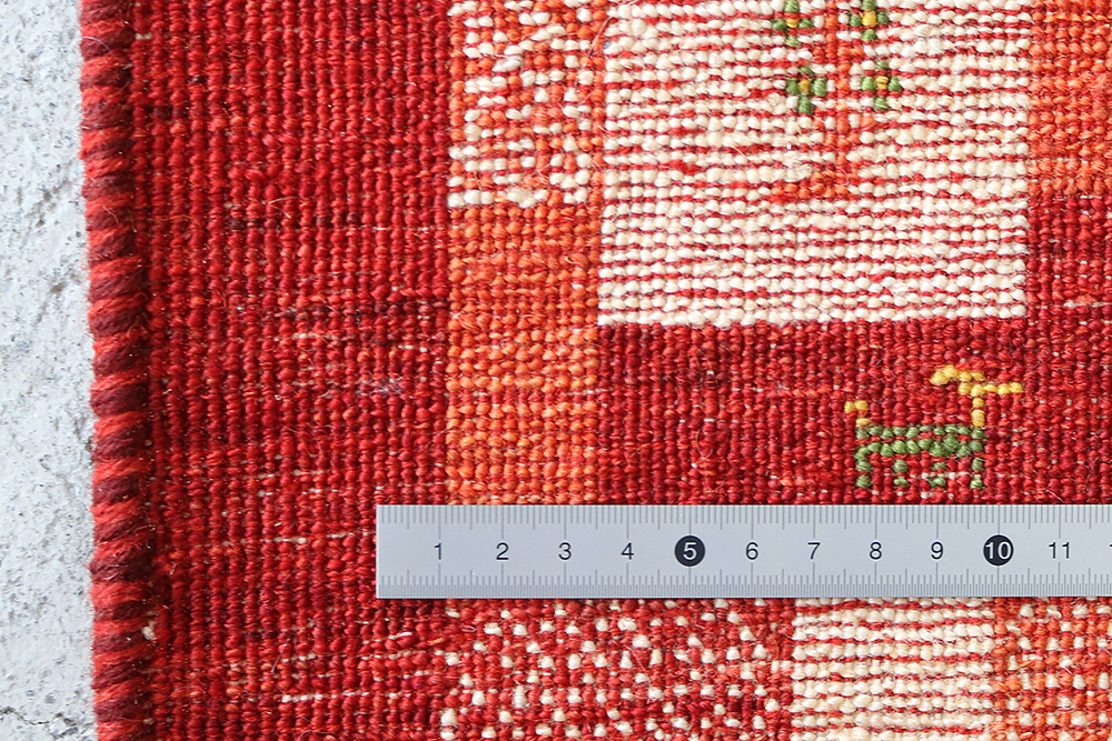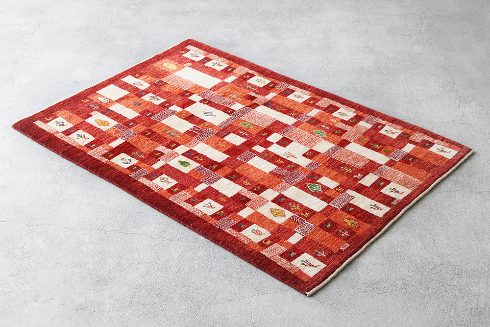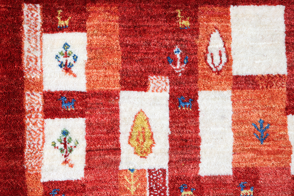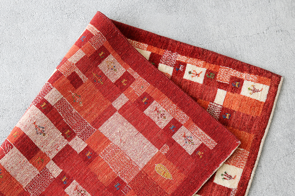明るい赤色にパッチワーク柄が映えた一枚。アイボリーの原毛や、グラデーションになった赤が可愛いですね。四角の中には植物や動物の文様が織り込まれています。カシュクリランクなので、織り目は非常に細かく、文様が美しく映えたギャッベです。縁は、色の濃さが違う赤の2色で編み込まれています。ギャッベは、イランの遊牧民が一枚一枚手織りした絨毯なので一点物となります。
