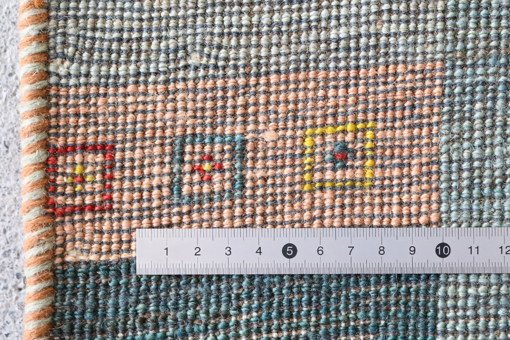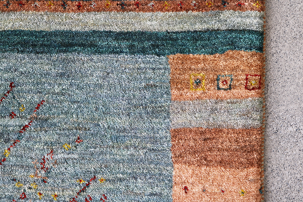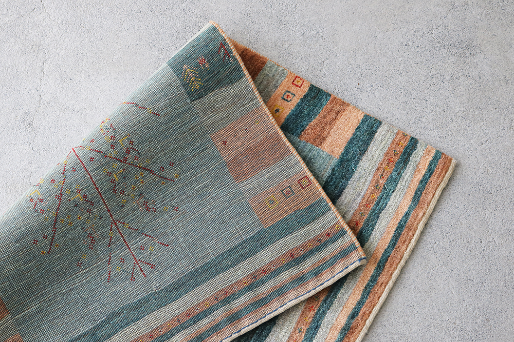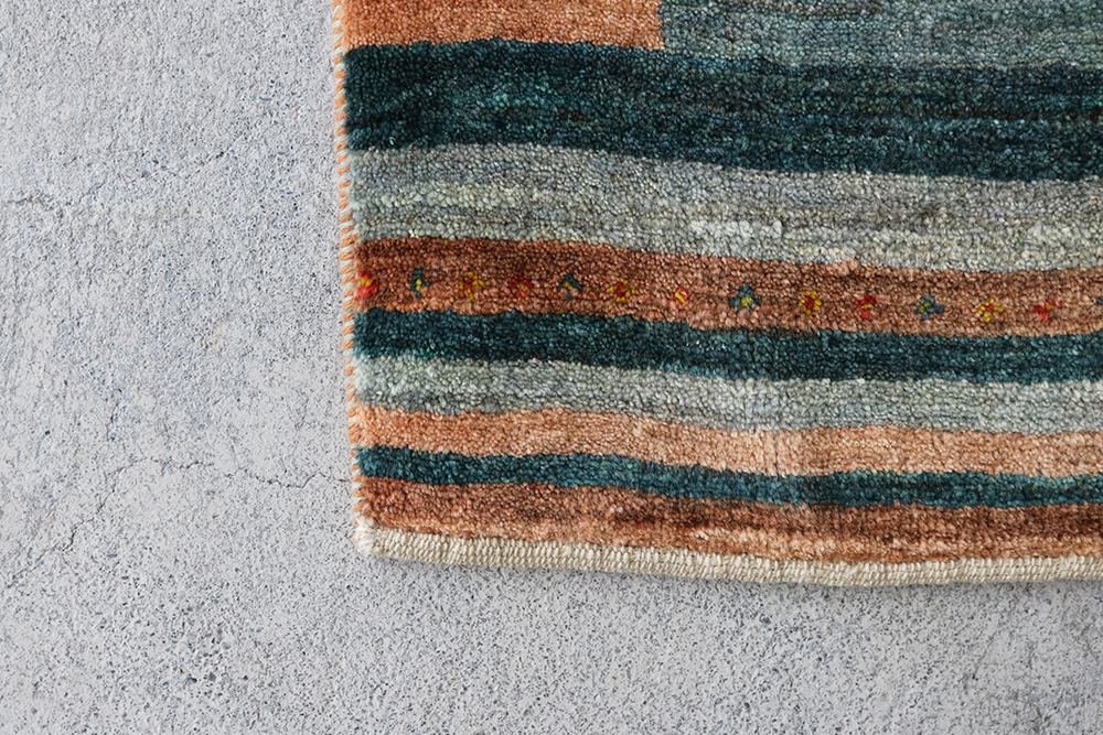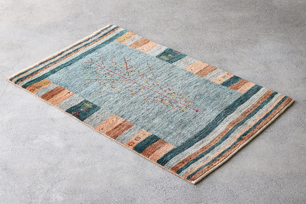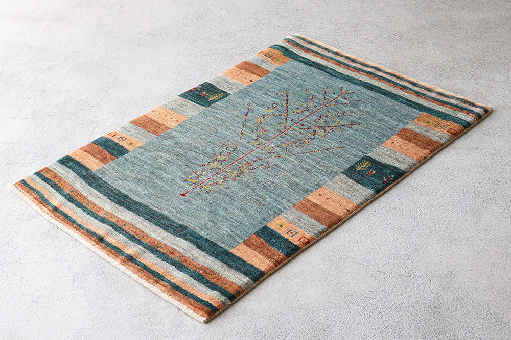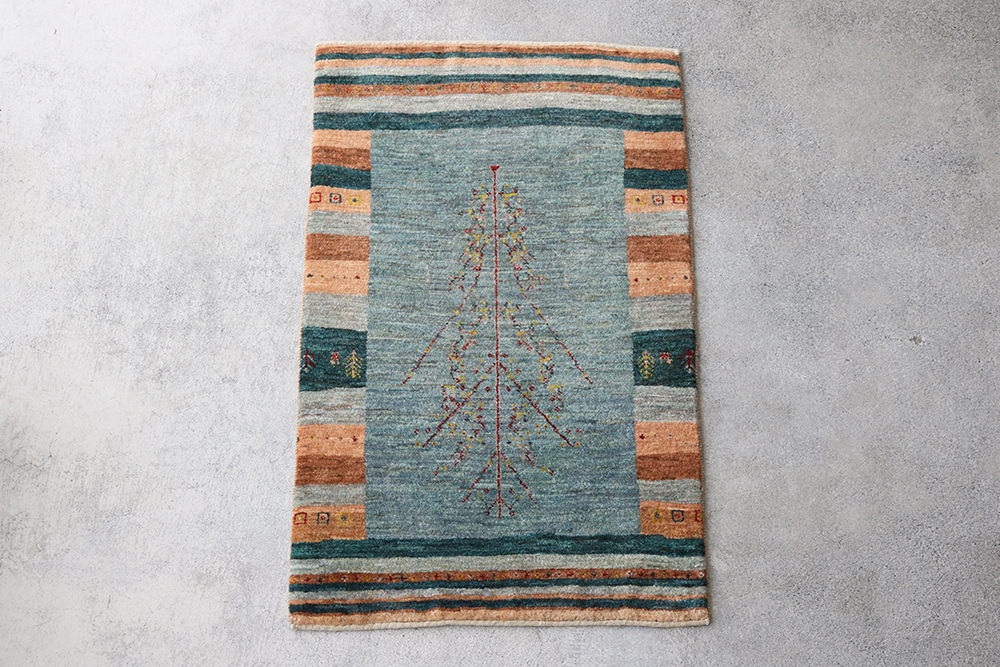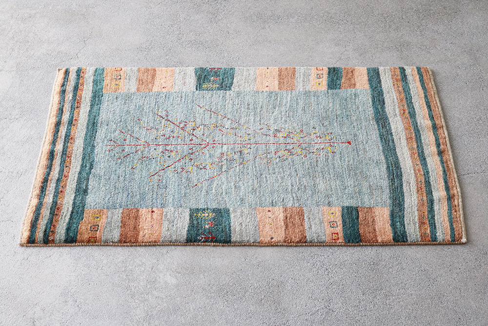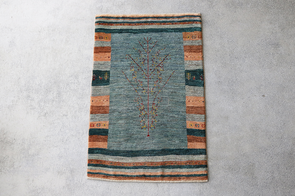 淡いカラフルなボーダーの中に、大きな木が描かれた一枚。動物や植物の文様が織り込んでいます。アマレランクなので織り目が細かく、質の良いウールを使用しています。縁は2色で編み込まれています。ギャッベは、イランの遊牧民が一枚一枚手織りした絨毯なので一点物となります。