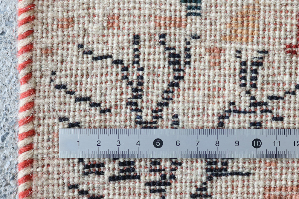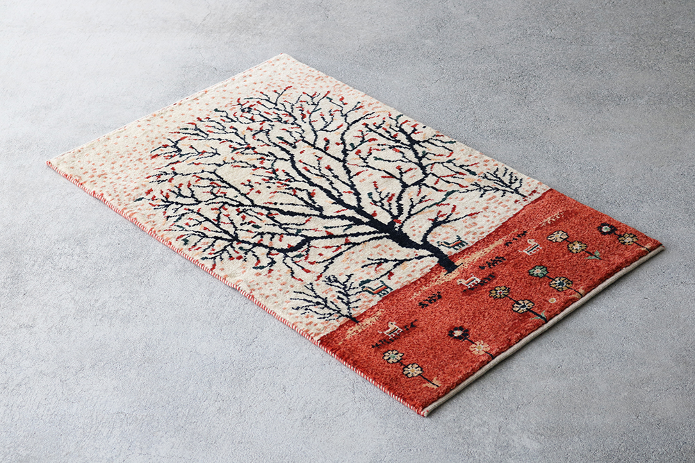 大きな木の周りに、お花や動物たちが集まっている絵画のような一枚。アイボリーやナチュラルな赤がまとまって落ち着いた色味のギャッベです。カシュクリランクなので、織り目が細かく文様が美しく映えたギャッベです。縁は2色で編み込まれています。ギャッベは、イランの遊牧民が一枚一枚手織りした絨毯なので一点物となります。