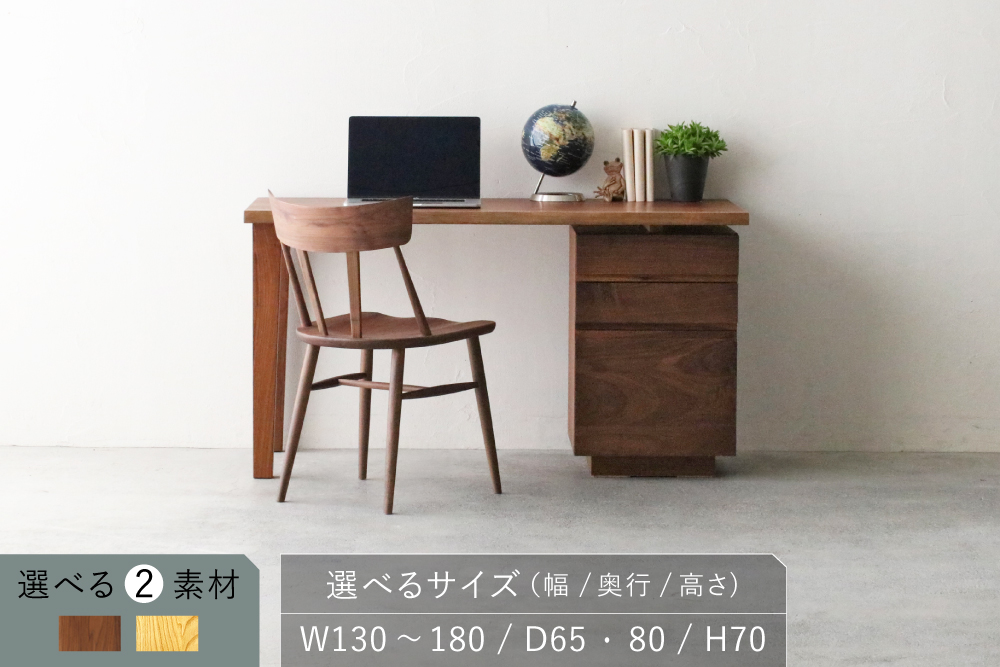 材種はウォールナット材・クリ材×オーク材の2種類から、幅は130cm〜180cmまで、奥行は65cm・80cmから、塗装はオイル仕上げとウレタン仕上げの2種類からお好みに合わせてお選びいただけます。また、引き出しの位置は天板の右側か左側どちらにでもおつけできます。(クリ材はこちらをご覧ください。)