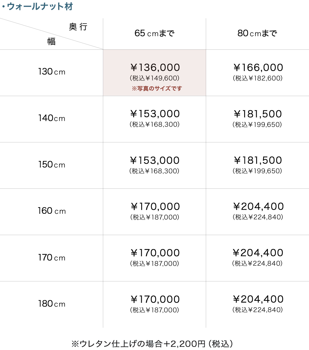 ※幅は130cm〜180cmから、奥行は65cmと80cmから お選びいただけます。