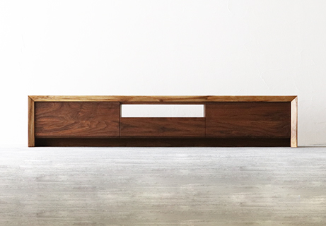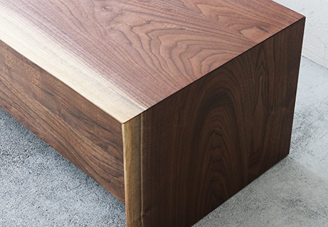 側板と天板のつながりが「門」に似ている為「MON」と名付けられたシリーズの一つです。その側板と天板とのつなぎ目に双方の切断部が見えないよう45度の角度で合わせる「留め」 という手法で作られている為、横から見ても美しい仕上げとなっています。正面からの木目の流れるようなつながりが魅力の一つでもあります。