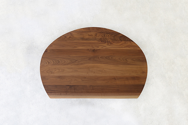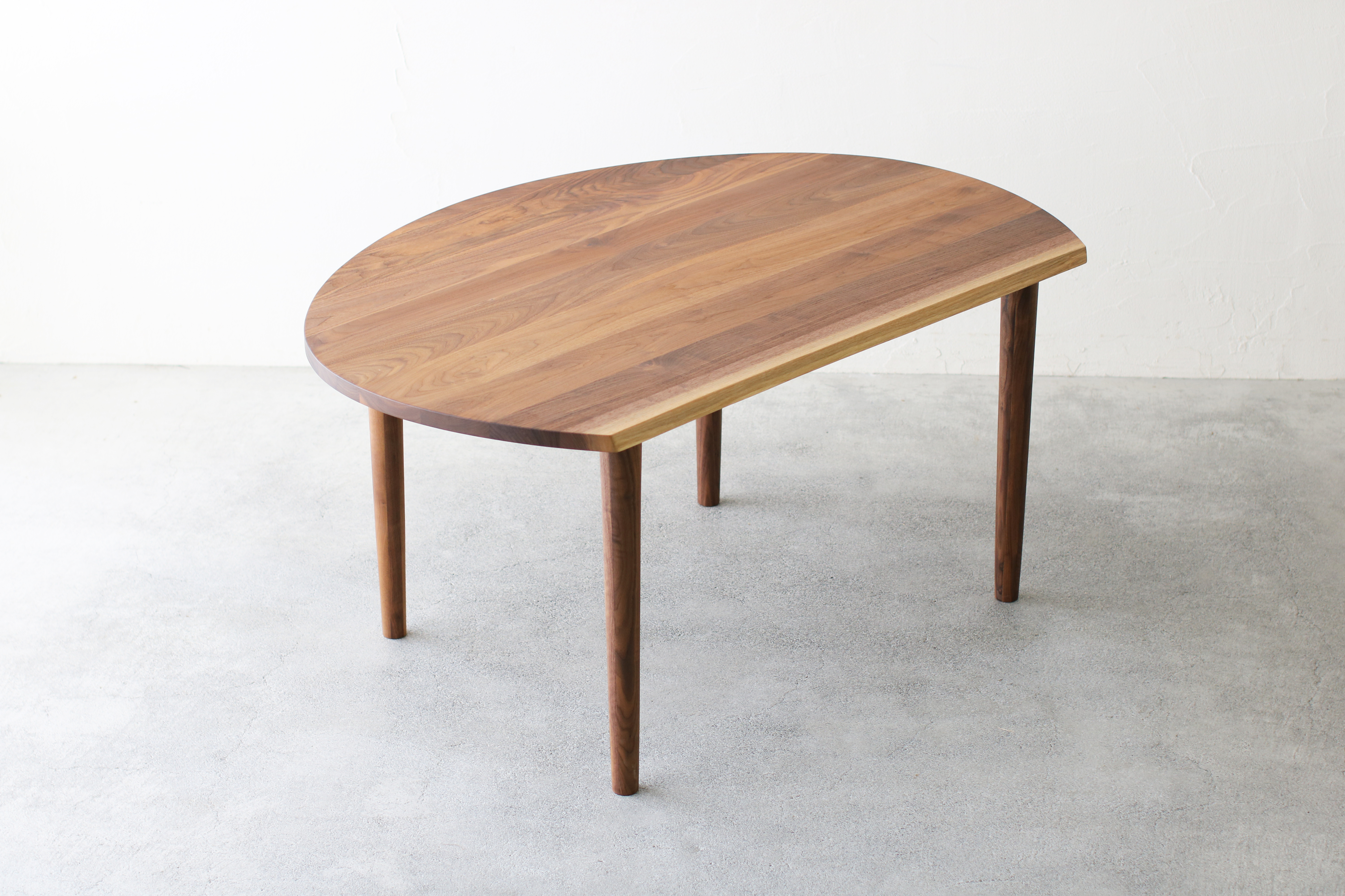 少し遊び心のあるユニークなデザインのダイニングテーブルです。直線部分に耳を使用し、天然木のぬくもりと共にコントラストも楽しめます。壁に付ければ省スペースで使用でき、お部屋もスッキリ広々と感じます。来客時などは円卓として使用できベンチや2脚の椅子を置けますので大勢で食卓を囲むことも出来ます。天板の端から50cmの位置で直線にカットしてあります。