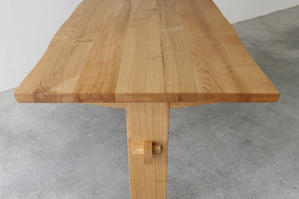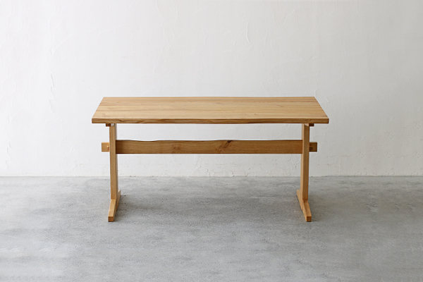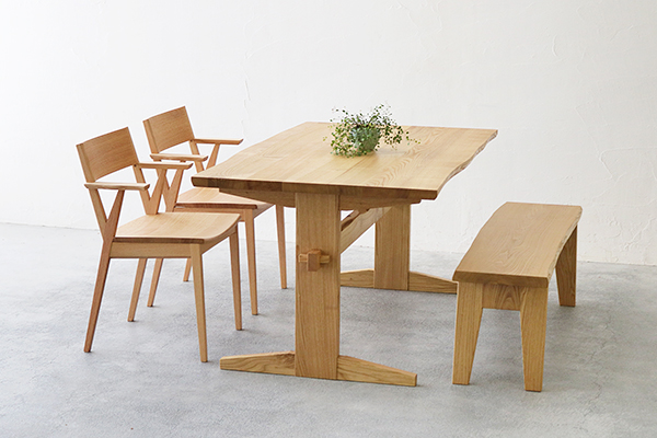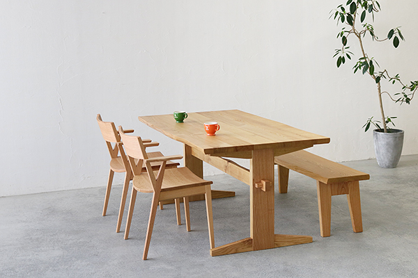硬くて丈夫、そして水や湿気に強いクリ材のダイニングテーブル。木目が美しいのもクリ材の特徴です。やわらかな優しい色合いから長くお使いになるにつれ深みある味わい深い色合いへと変化していきます。材質だけでなく楔を使うなど和洋どちらにも合うデザインが印象的です。
