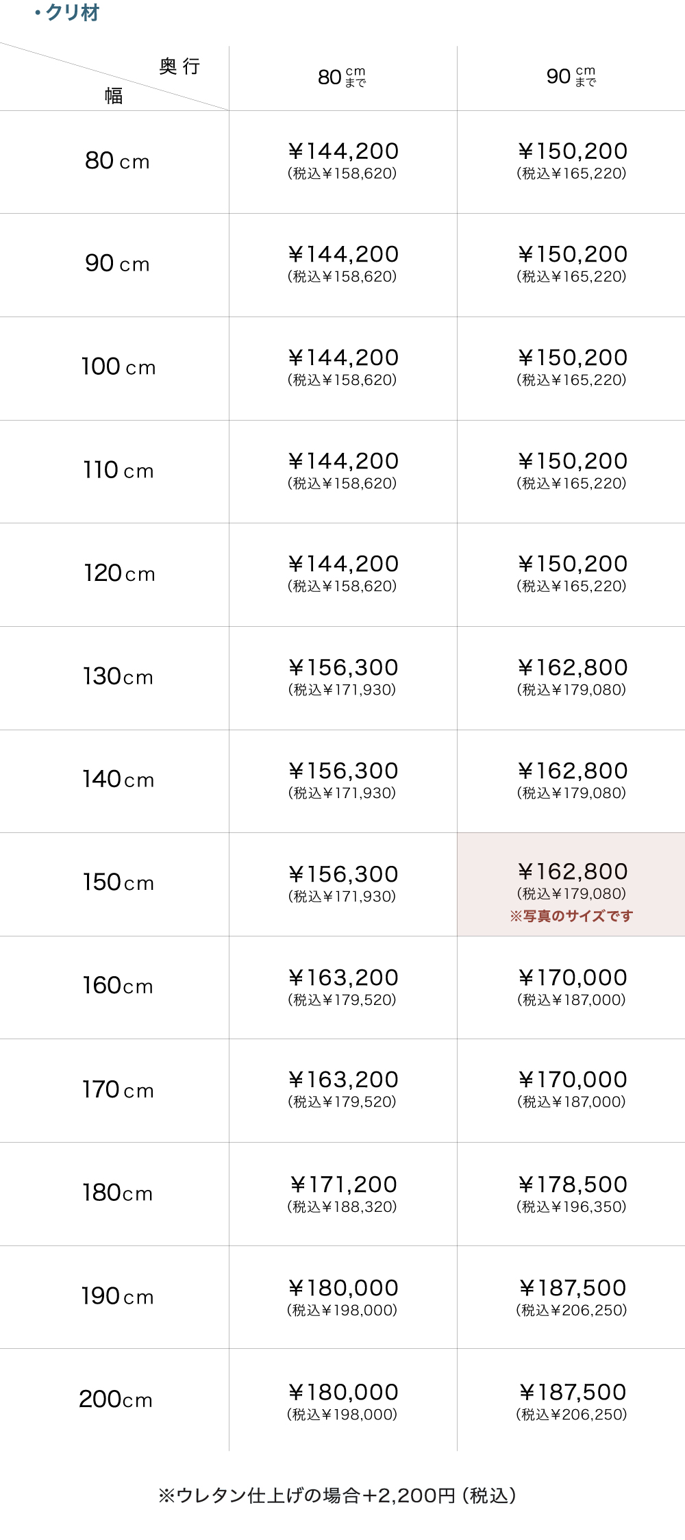 幅は80cmから200cmまで、奥行は80㎝と90㎝から、塗装はオイル仕上げとウレタン仕上げの2種類からお好みに合わせてお選びいただけます。