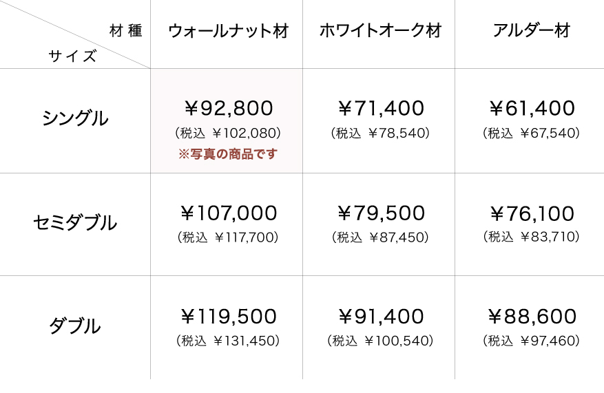 樹種はウォールナット材・オーク材・アルダー材の3種類から、サイズはシングル・セミダブル・ダブルの3サイズからお好みに合わせてお選びいただけます。